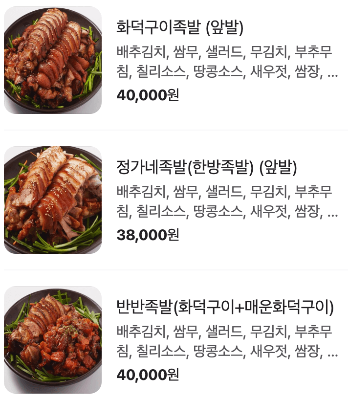 저희는 항상 화덕구이 족발 앞다리로 먹어요! 가격은 40000만원입니다.