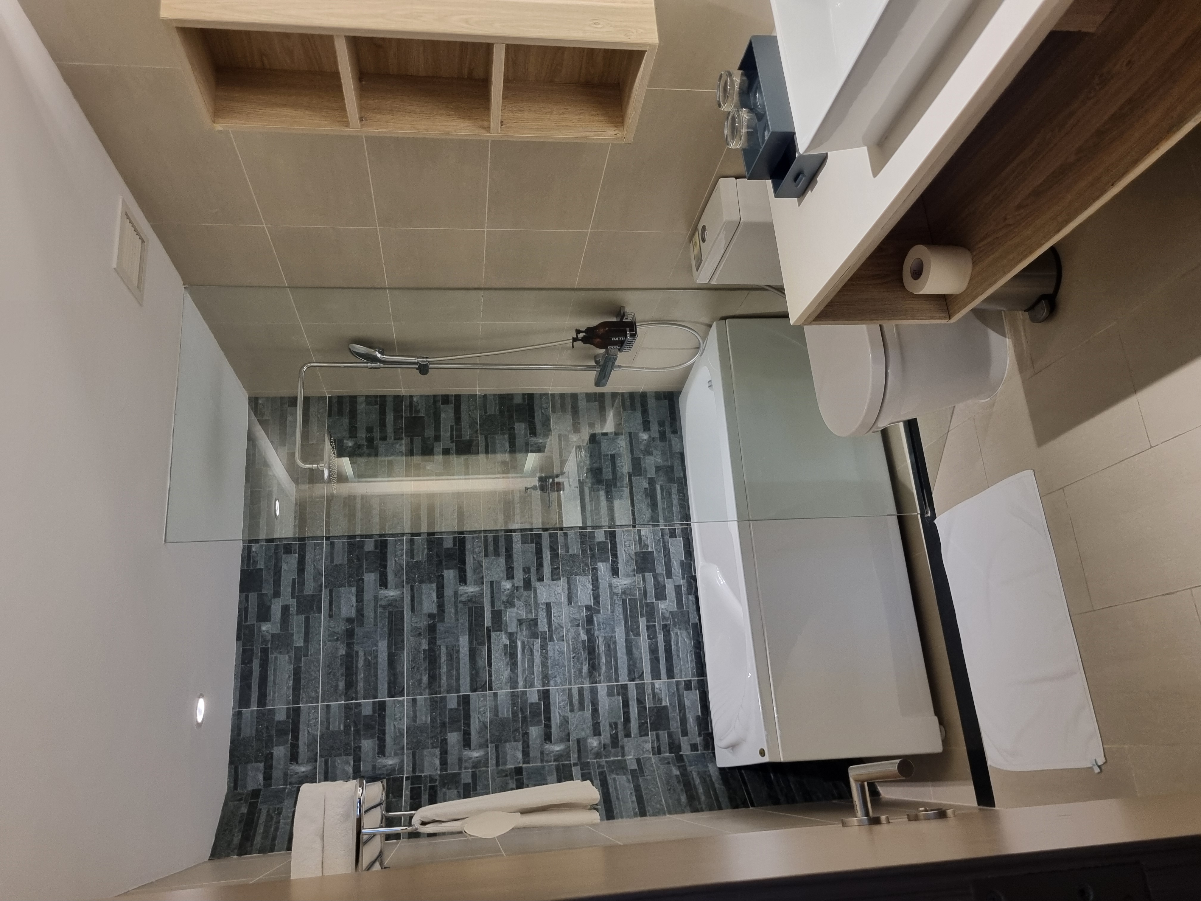 거실 화장실에는 샤워실만 존재하는 큰 화장실이 있고 방 1개에는 욕조까지 함께 있는 화장실이 있었습니다. 어메니티로는 핸드워시, 바디워시, 샴푸가 존재하고 린스는 없었습니다. 칫솔치약과 면봉, 바디로션은 제공됩니다.
