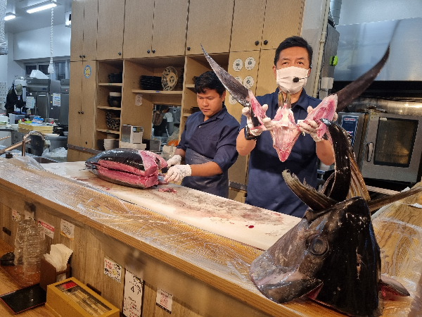식사는 푸드 코트가 있는데 소바 혹은 텐동이 800엔~900엔 대로 아주 저렴하며, 시장에서 고른 초밥도 850엔 정도 하였습니다. 푸트코트는 4-5시면 문을 닫기 때문에 저희는 이용을 못해봤습니다. 대신 이토만 수산 시장에서 늦게까지 장사를 하는 참치 해체 쇼를 볼 수 있는 식당에서 저녁을 먹었고, 남편은 참치덮밥을 먹었고, 저는 장어 덮밥을 먹었습니다.